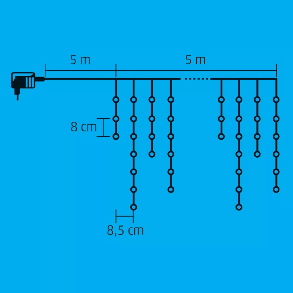 Ez a lenyűgöző fényfüggöny 300 melegfehér LED-ből áll, melyek minden második füzérben egy hidegfehér LED villogásával teszik még különlegesebbé az ünnepi fényt. A fehér vezetékkel rendelkező, 5 méter hosszúságú fényfüggöny harmonikusan illeszkedik bármilyen környezetbe, biztosítva a kellemes és meghitt hangulatot.