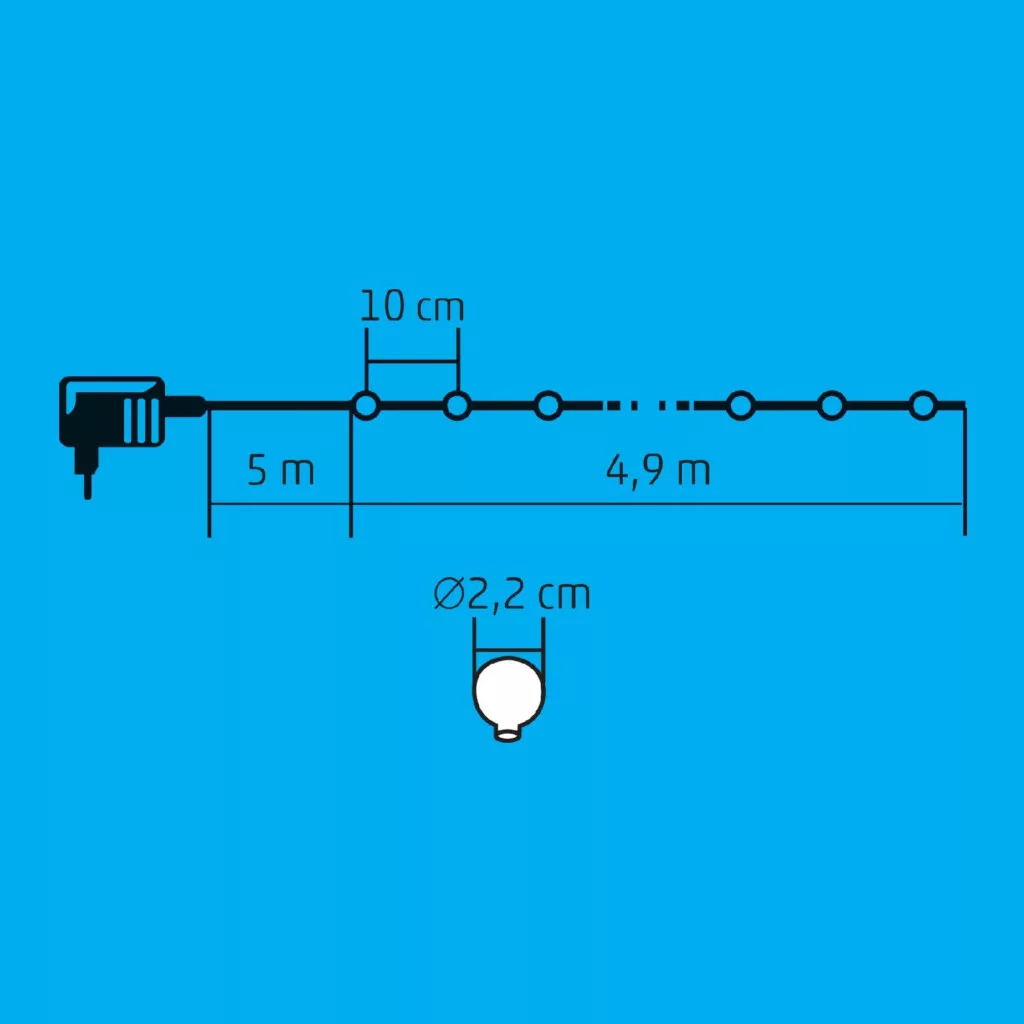 A KBC 50 pont ezt nyújtja Önnek! Ez a kül- és beltéri kivitelű fényfüzér 50 darab, egymástól függetlenül színváltó LED-del rendelkezik, amelyek mind opál gömb dekorációkban helyezkednek el.