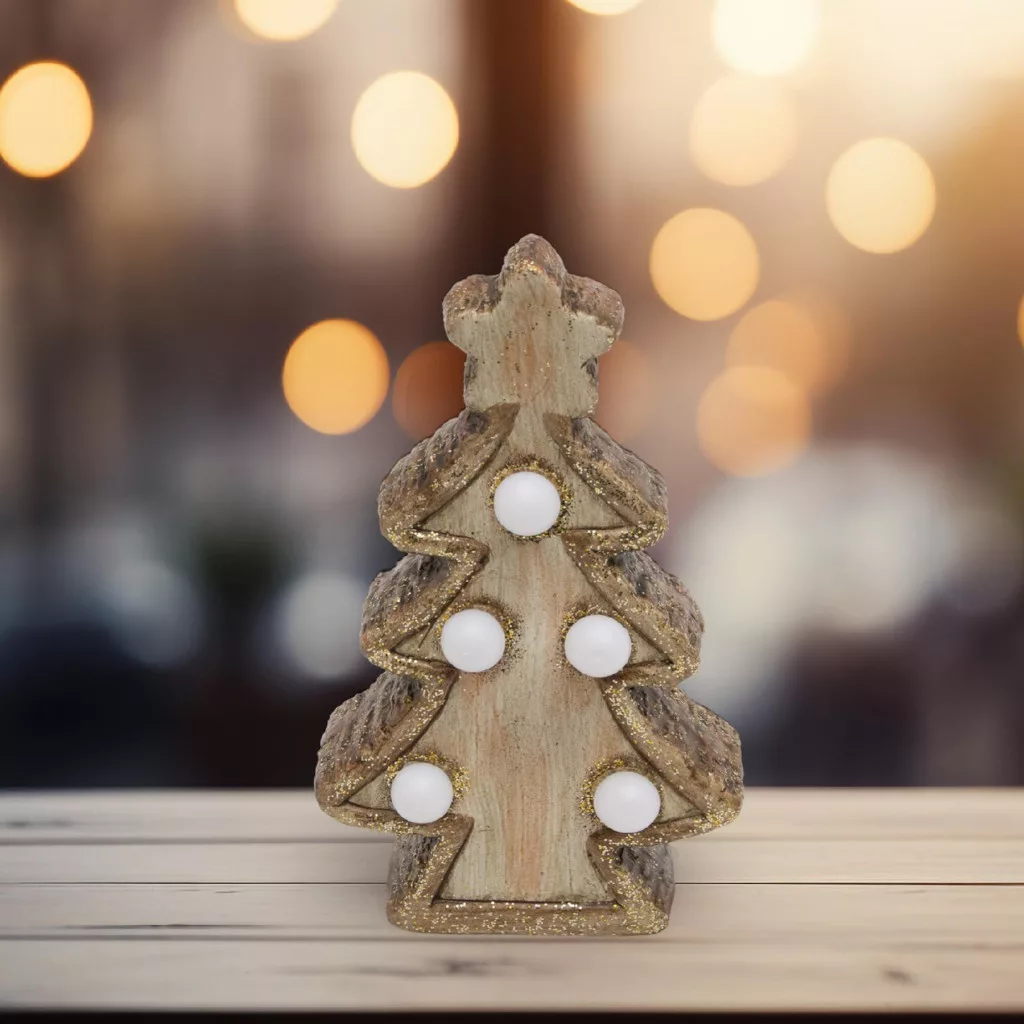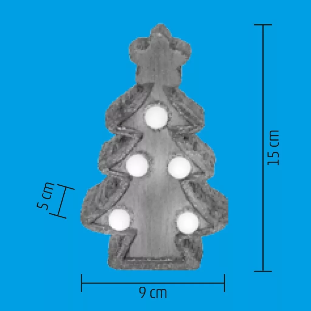 Ez a beltéri kivitelű, kerámiából készült fenyőfa öt darab melegfehér LED-del világít, amelyek apró, ragyogó gömbök formájában díszítik a fát. A LED-ek kellemes, meleg fényt sugároznak, amely azonnal meghitt hangulatot teremt a szobában. A dísz mérete (9 x 15 x 5 cm) tökéletesen illeszkedik kisebb helyekre, legyen az egy polc, asztal vagy ablakpárkány. A tápellátást 2 db 1,5 V-os LR44 gombelem biztosítja, melyeket a csomag tartalmaz, így azonnal használatra kész.