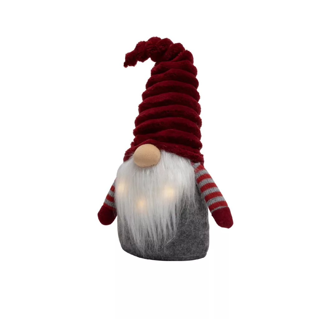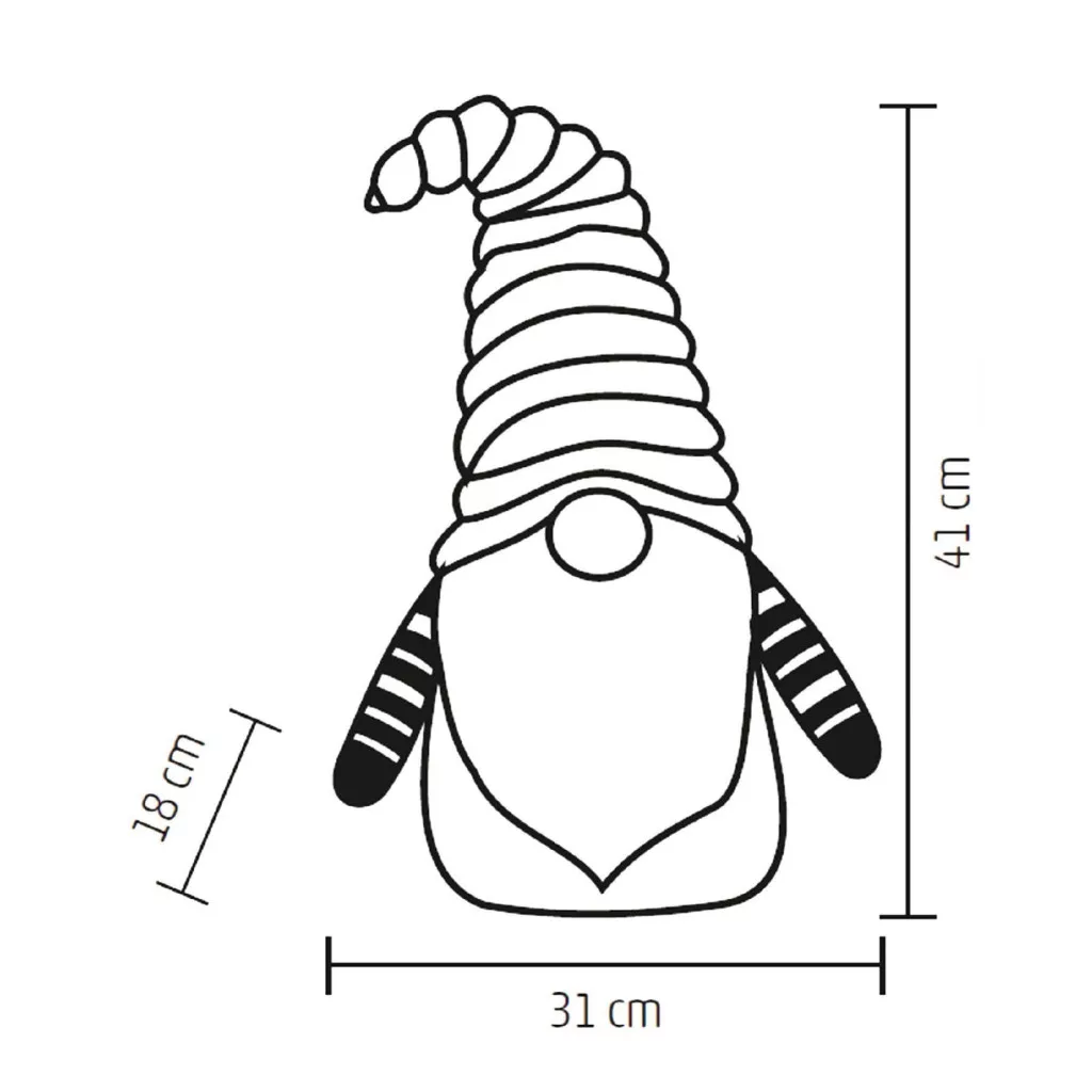 A manó szövetből és plüssből készült, ezért puha tapintású, és kiváló kiegészítője bármely beltéri karácsonyi dekorációnak. Vidám megjelenése minden korosztály kedvence lehet, és garantáltan mosolyt csal az arcokra. A dekoráció 2 darab 3 V-os CR2032 elemmel működik (tartozék), így azonnal használatba vehető, és bárhol elhelyezhető otthonában, ahol egy kis extra fényt és ünnepi varázslatot szeretne. A 31 x 41 x 18 cm méretű manó remekül mutat az ablakpárkányon, polcon vagy akár az ünnepi asztalon is.