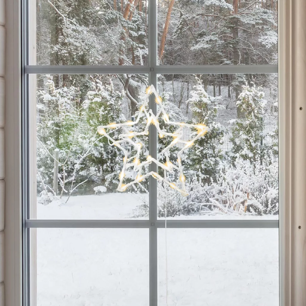 Ez a dekoráció 35 db Ø5mm melegfehér LED-del van felszerelve, amelyek hangulatos, ünnepi fényt árasztanak. A 1,5 méteres fehér tápkábel az alján helyezkedik el, így könnyen csatlakoztatható az áramforráshoz anélkül, hogy zavaró lenne. A termék mérete 33 x 28 cm, így ideális méretű, hogy bármelyik ablakban elhelyezze.