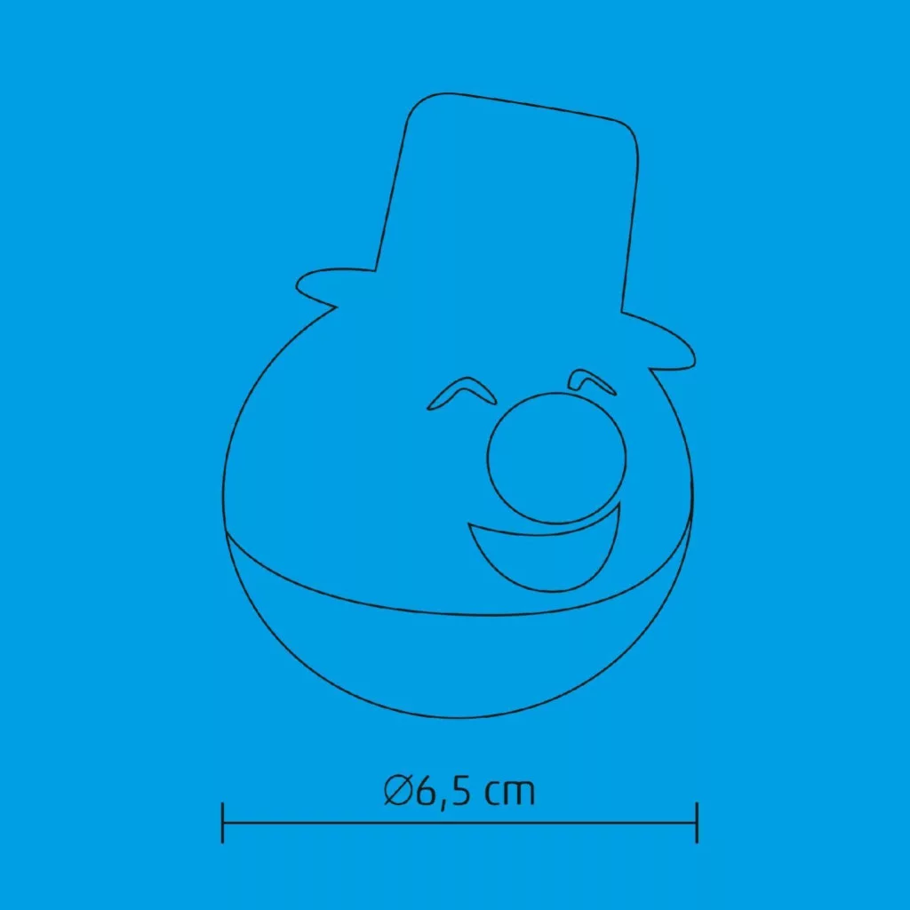 Ez a bájos kis dekoráció egy villogó piros LED-del van felszerelve, amely feldobja az ünnepi hangulatot. Az 6,5 cm átmérőjű hóember gömb tökéletes kiegészítője bármilyen karácsonyi dekorációnak. A termék tápellátását 3 db LR44 elem biztosítja (tartozék), így azonnal használatba vehető, és bármikor újabb fényhatást varázsolhat otthonába. A praktikus kialakítás és az egyszerű működés miatt könnyedén kombinálható más dekorációkkal is, és vidám villogásával garantáltan feldobja az ünnepi atmoszférát.
