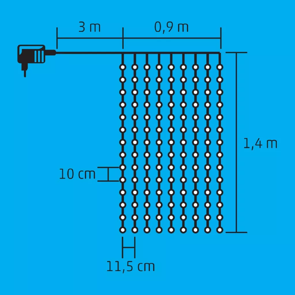 Ez a lenyűgöző fényfüggöny 126 melegfehér LED-ből áll, amelyek kilenc füzérre vannak elosztva, füzérenként 14 LED-del. A 90 cm hosszúságú füzérek könnyedén elhelyezhetők bármilyen beltéri környezetben, legyen szó nappaliról, hálószobáról, vagy akár egy ünnepi asztalról. A fényfüggöny 3 méter hosszú tápvezetékkel rendelkezik, így a hálózati adapter segítségével könnyen csatlakoztatható a hálózathoz, biztosítva a folyamatos és megbízható működést. A melegfehér fények ragyogó fénye meghitt és varázslatos atmoszférát teremt otthonában.