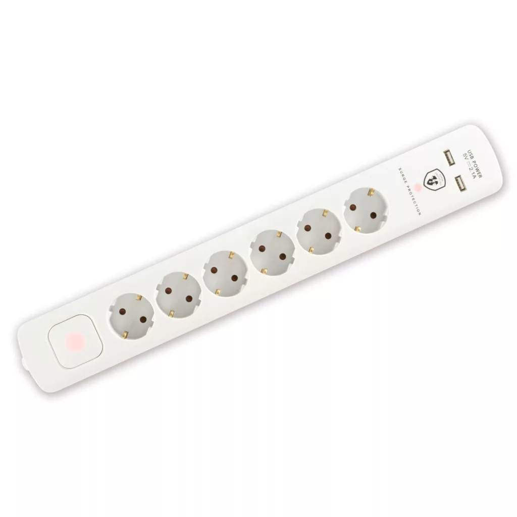 Home NVT 06K USB/WH túlfeszültség védett hálózati elosztó, 1,4 m, kapcsolós, H05VV-F 3G1,5 mm2 kábel, 6 aljzat, max. 3680W, falra akasztható, USB töltőaljzatok