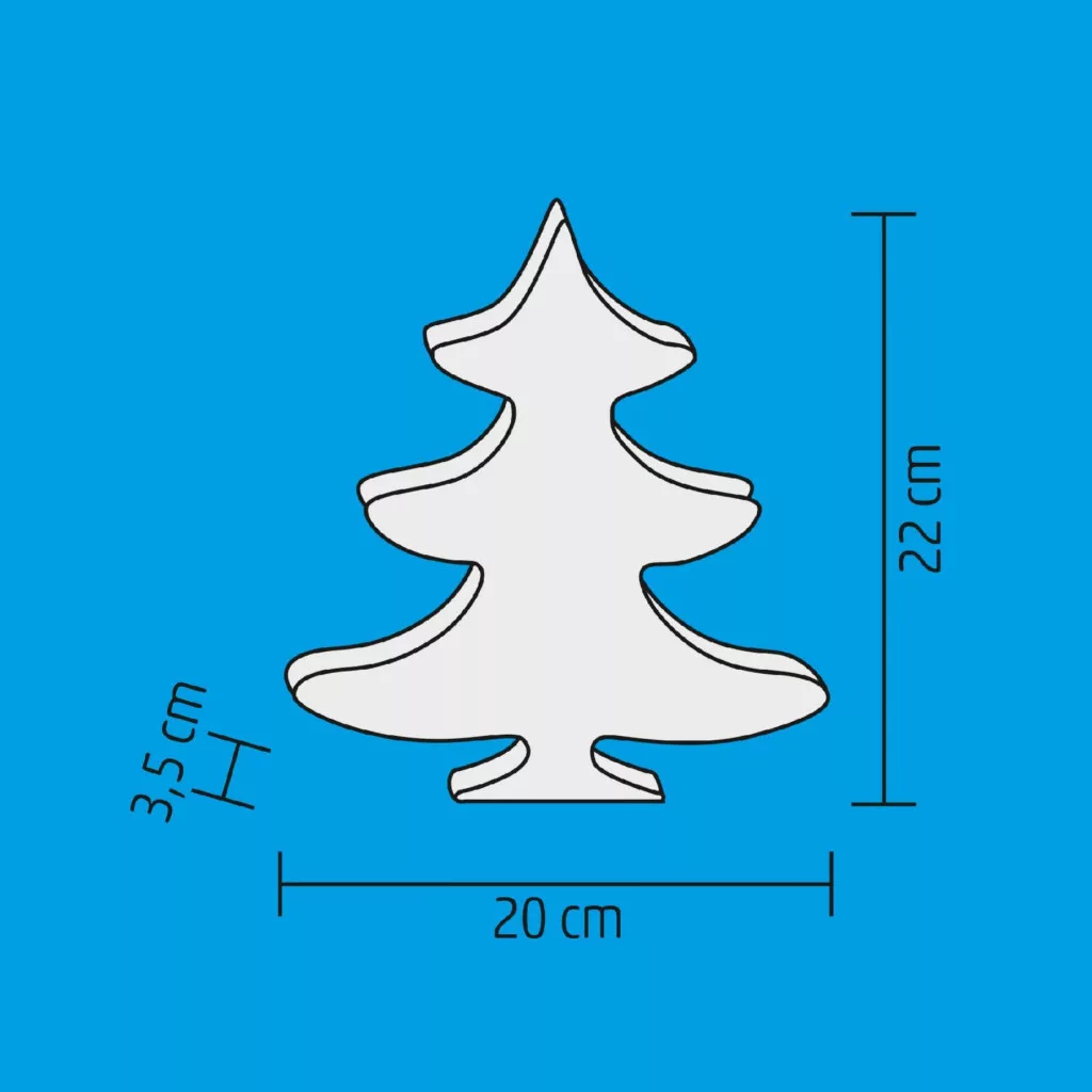 Ez a 20 x 22 x 3,5 cm-es dísz 7 db LED-del van ellátva, amelyek látványos alagúthatású fényhatást hoznak létre, a dísz mindkét oldalán ragyogó fényeket biztosítva. Az asztali dísz átlátszó vezetéke diszkréten olvad bele a környezetbe, így csak a fenyőfa ragyogása kerül a figyelem középpontjába. A műanyag kialakítású fenyő könnyen mozgatható és stabil, tökéletes kiegészítője bármilyen beltéri karácsonyi dekorációnak, legyen szó asztalról, polcról vagy akár ablakpárkányról.