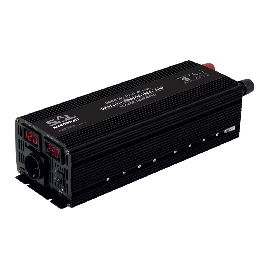 SAL SAI4000LED feszültségátalakító, 2000 W/ 4000 W, módosított szinuszos, digitális kijelző, LED visszajelző, túlterhelés, túlfeszültség, rövidzárlat, kimerülés és túlemelegedés védelem