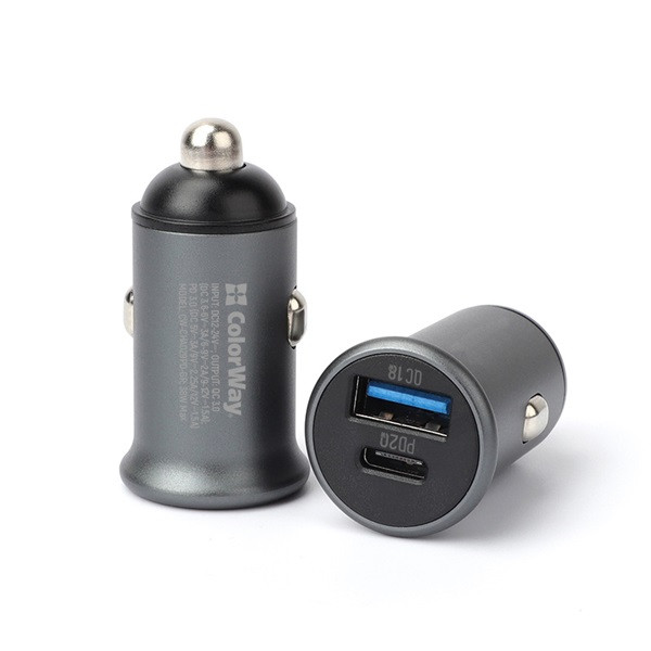 Car charger Colorway 2USB (Type-C PD20W + USB QC3.0) (38W) Gray is a powerful adapter ideal for charging Apple iPhone 12 Pro / 12 Pro Max / 12 mini / 12/11 Pro / 11 Pro Max / 11 / SE / XS / XS Max / XR / X / 8/8 Plus, Apple iPad Pro 12.9 / iPad Pro 11 "/ iPad Pro 11"