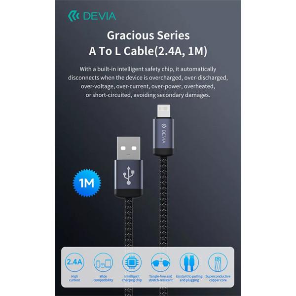 DEVIA ST108035 Gracious v2 12W USB/Lightning adat-és töltőkábel, fekete, 1m
