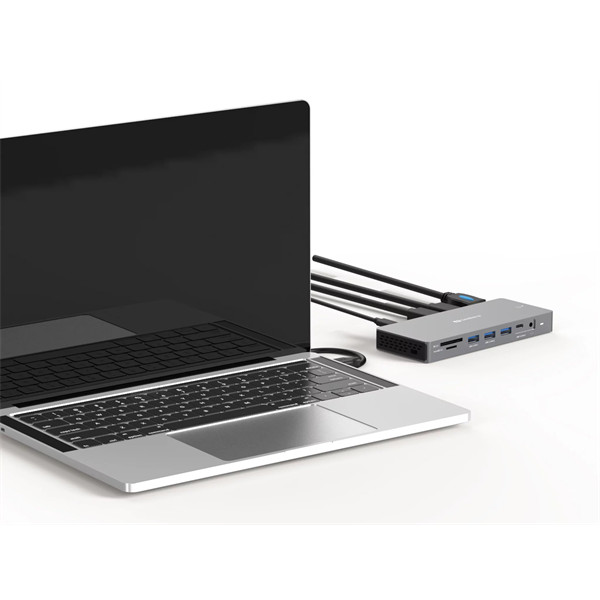 • Connectors: 1 x USB-C female for power through (supporting up to 100W), 1 x USB-C for data, 2 x HDMI Female, 1 x DP female, 3 x USB 3.0 A female, 1 x USB-C 3.1, 1 x RJ45 female, 1 x Audio output