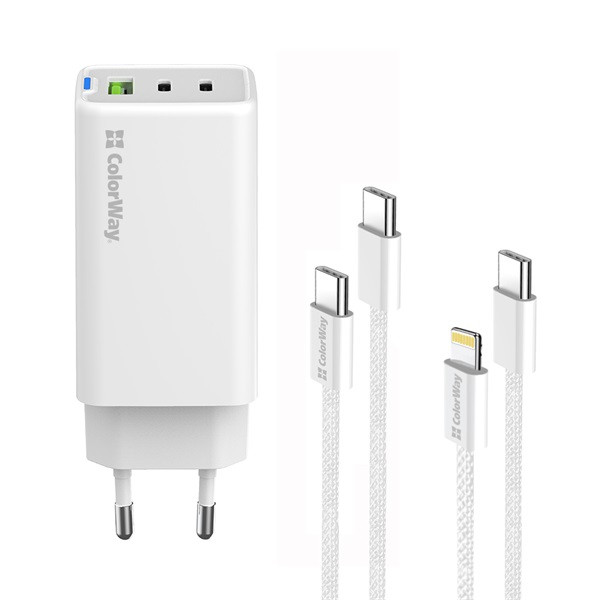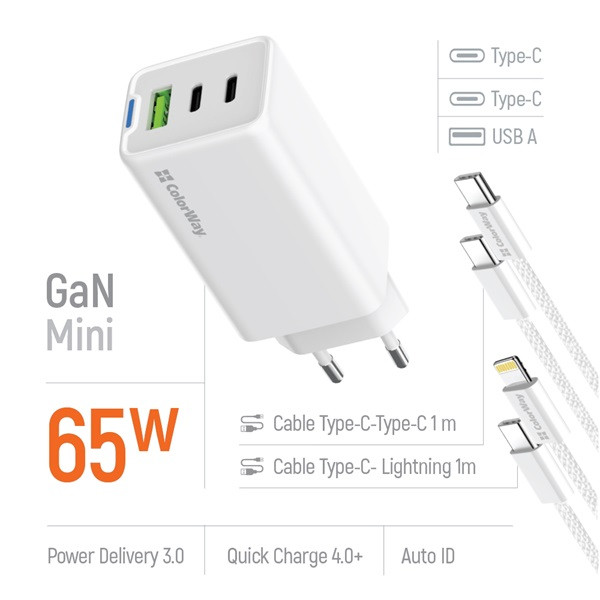AC töltő ColorWay GaN Mini 65W PD port PPS USB (USB-2C1A) kábel Type-C és Lightning (CW-CHS058PDCL-WT) |