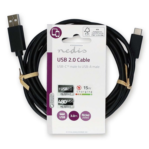 Nedis CCGL60600BK30 USB A - USB C (USB-C) kábel, USB2.0, 15W, hossz 3m