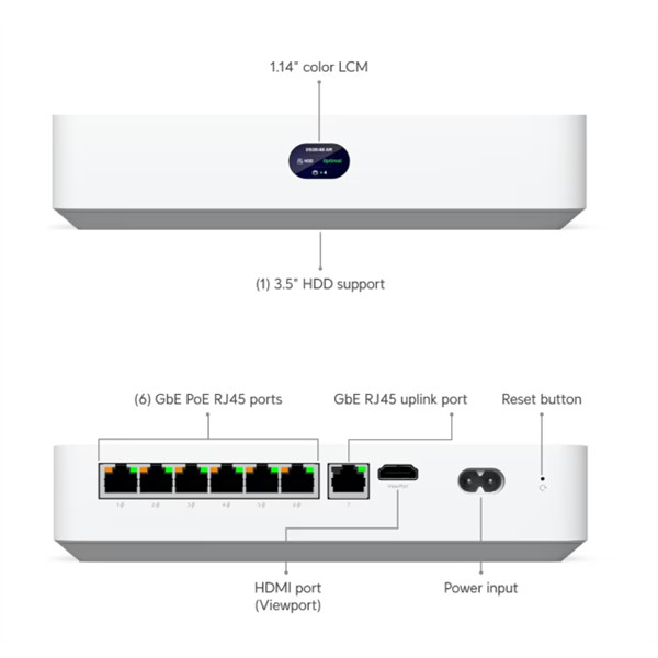 (1) GbE RJ45 uplink port (6) GbE PoE RJ45 downlink ports (1) HDMI port (Viewport)